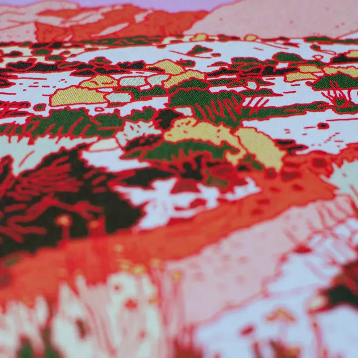 Warm and glowy, this print includes many shades of red and pink, cream, differing shades of green, and a blue and purple sunrise! This art has been printed on thick and durable matte paper using giclée print technology to ensure the highest quality. We love art, we love nature, and we strive to love nature well by printing all of our prints on FSC (Forest Stewardship Council) certified paper.