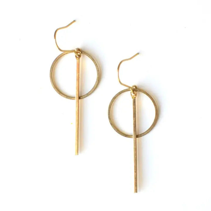 Minimal, but not messing around. These raw brass earrings feature a bold circle-and-line design that plays with shape and space. They hang about 2" from the top of the hook and are roughly ¾" wide—lightweight, sculptural, and easy to wear on repeat.